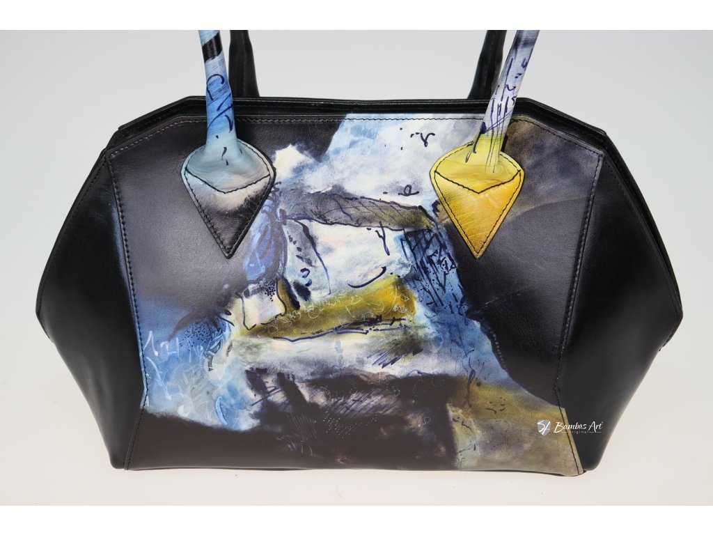 Model 471 is an exquisite handbag to carry in hand or over the shoulder. The tradition of Czech Cubism inspires the shape of this particular bag. Zippered closure, the interior side zip pocket, an open compartment, a phone compartment, and a carabiner strap for hanging keys or securing a wallet. The round-shaped holders have a length of 73 cm. A characteristic feature of all Bambas Art handbags is their handles. While attached to the artistic part of the body, they always complement the color composition of the given area and thus become an inseparable part extending the art design. No counterfeit attempts would feature the same treatment — A handle as proof of authenticity.