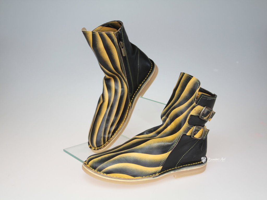 Kotníkové kozačky Out of Trend jsou výsledkem spolupráce společností Boty Jančařík a Bambas Art Original. Spojením dokonalého ševcovského řemesla s uměleckým designem vznikly výjimečné boty, které nelze přehlédnout. Celokožená bota je postavena na syntetické podešvi, která je pružná a vhodná do každého počasí. Svrchní části jsou zhotoveny z prémiových lícových hovězinových usní italské provenience v top kvalitě. Pohodlný nástup do boty je umožněn pevným zipem z vnitřní části a dva řemínky s přezkou na vnější straně slouží k přizpůsobení objemu boty nad kotníkovou částí nohy. Barvy výtvarné části a technologie její ochrany jsou šetrné k přírodě. Originální ruční malba na celé velké ploše nártu činí z této boty umělecký zážitek.